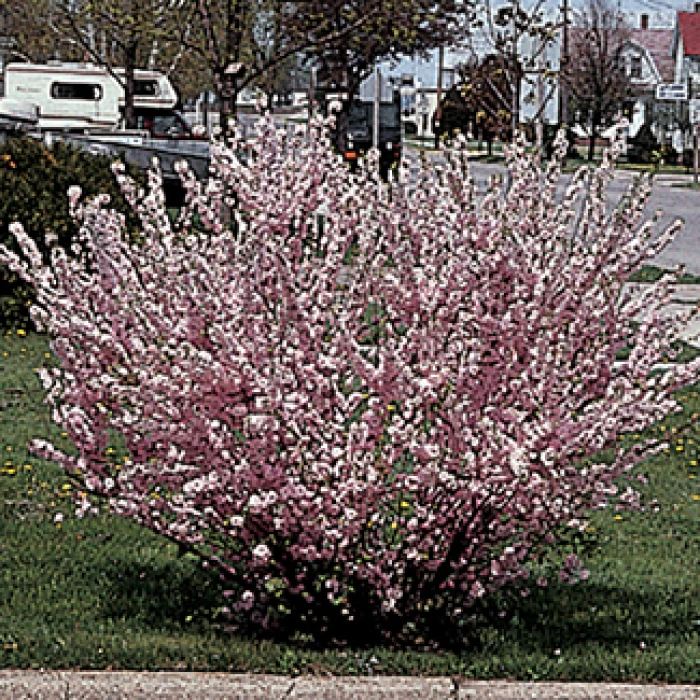 Zones 2-6. One of the first shrubs to blossom in spring. In April and May the stems are covered with double, delicate pink flowers that resemble small roses. Prune the lower branches to use as a small tree or leave unpruned to form a bushy 6 to 10 foot shrub. Also known as Double Flowering Plum. Ht: 6-10′.
